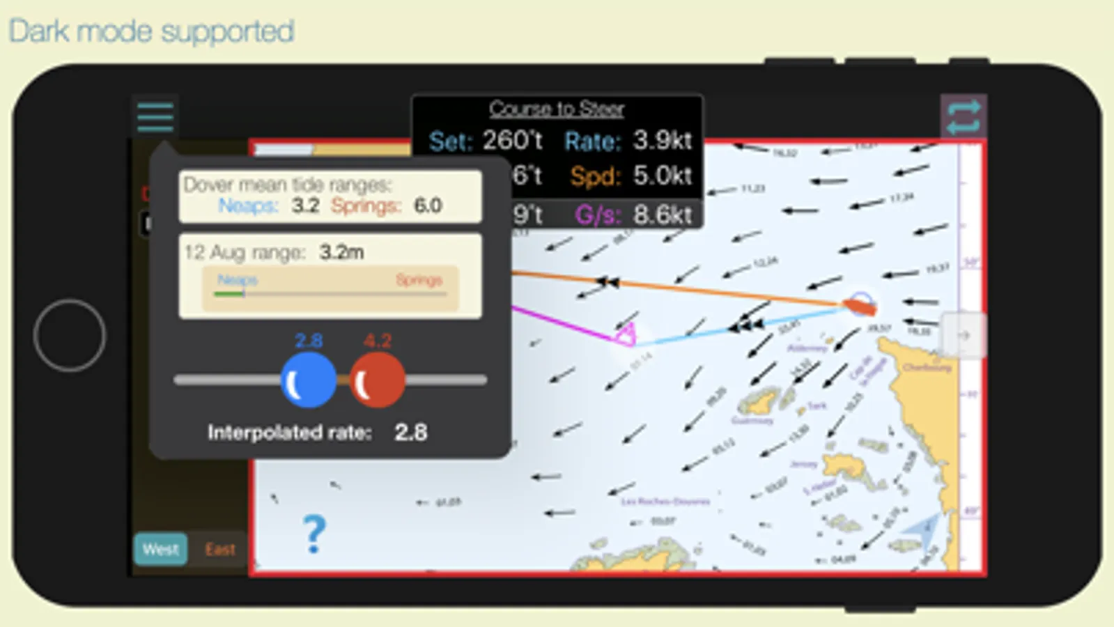 iStreams displays the valid hourly English Channel tidal stream atlas for the current real time, in reference to the time of high water at Dover... a smart app, fully functional offline. With tools to measure tide set and interpolated rate.