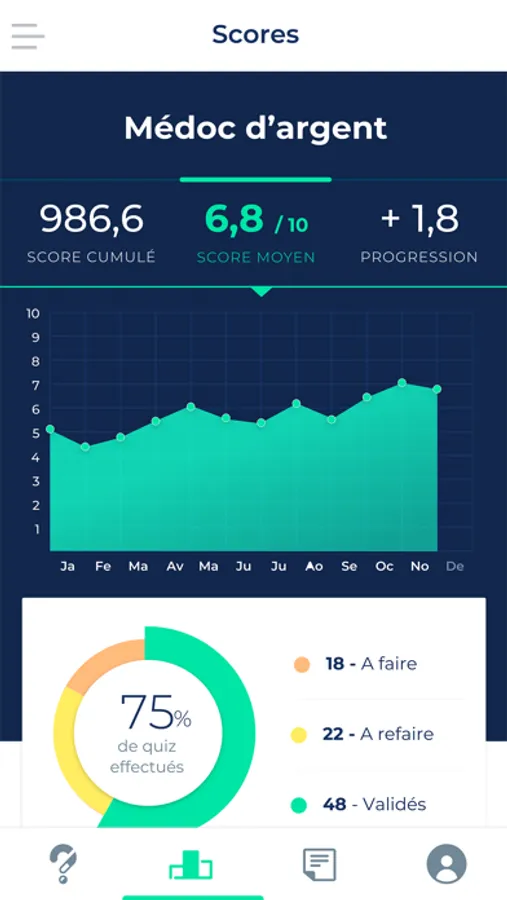Différents éléments visuels vous permettent de visualiser votre progression : score cumulé, score moyen, taux d’amélioration, nombre de quiz validés (score>70/100).