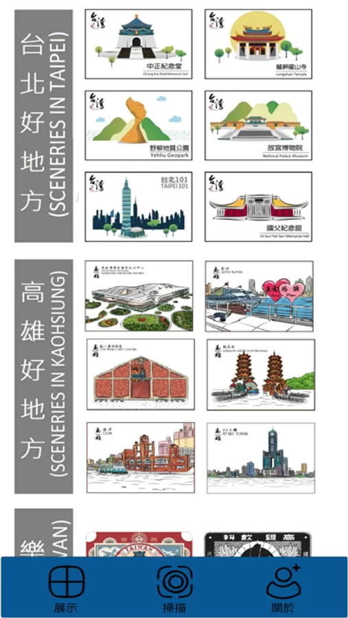 進入AR掃描頁後,掃描各景點的繪圖,在繪圖的右方會產生AR虛擬的內容操控鍵.透過碰觸AR虛擬按鍵,使用者可以選擇該景點的相關訊息並進行了解.