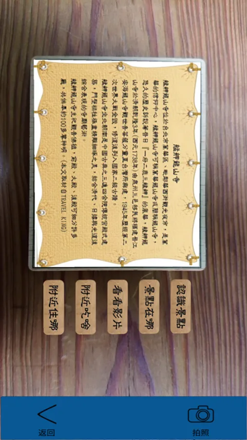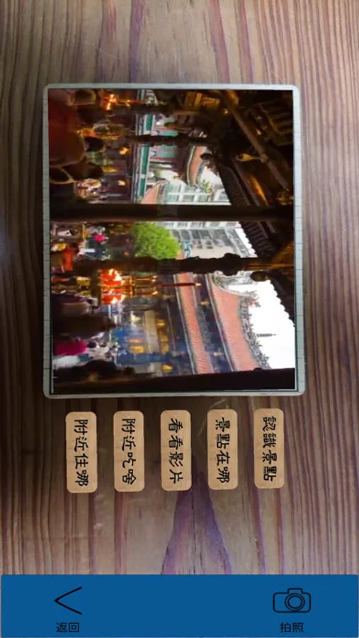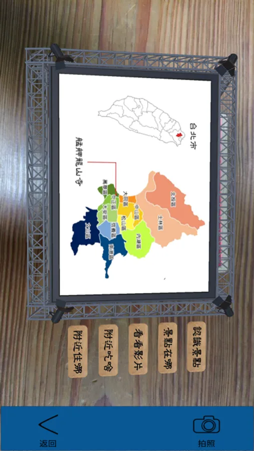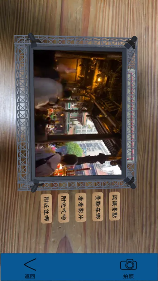 AR虛擬按鍵有:認識景點/景點在哪/看看影片/附近住哪/附近吃啥五個虛擬按鍵.