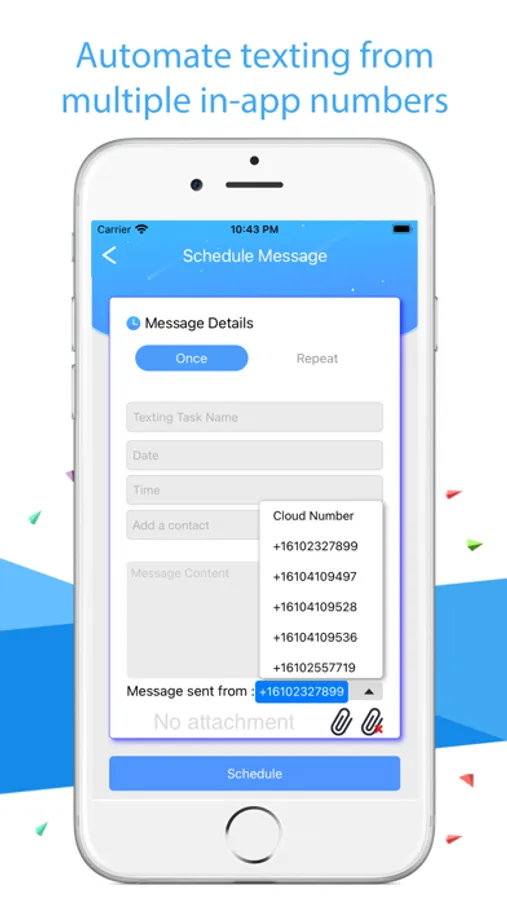 - Acquire numerous US and Canadian phone numbers within the app for the automated or manual dispatch of text messages at designated dates and times. Each US or Canadian number is capable of receiving an unlimited number of messages at no cost;