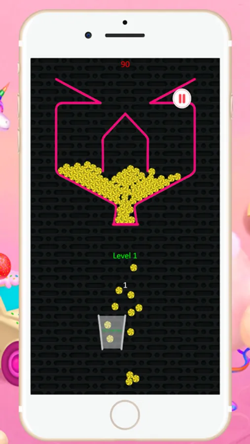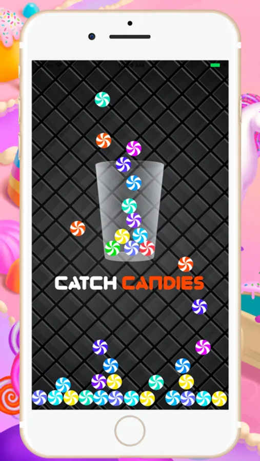 The goal of the game is to fill moving cups with falling candies by opening the gate of the pot by touching on the screen. For each candy you manage to get through the glass you’re rewarded with a different amount of points, depending on its color. If the candies misses the glass, it disappears.