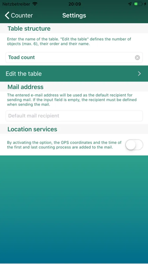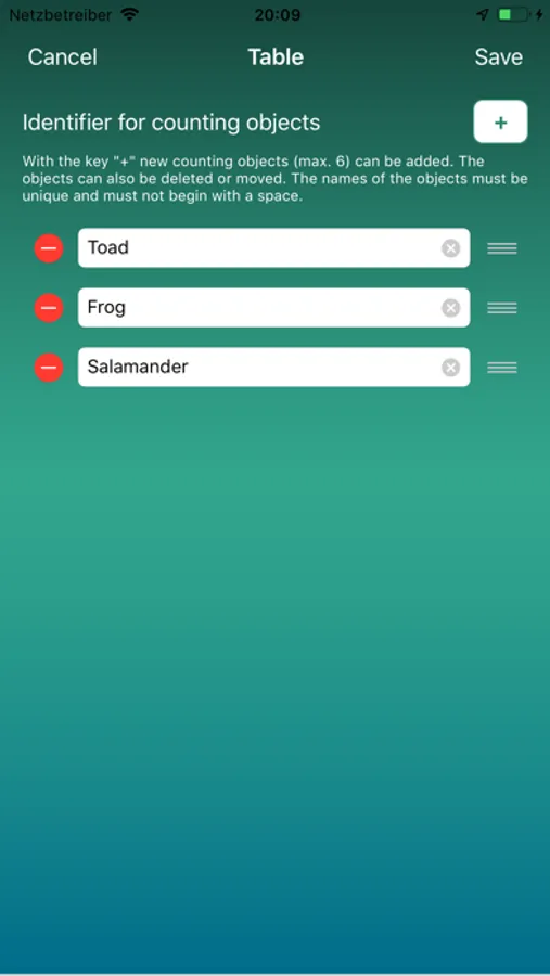 In the app you can define a maximum of 6 objects in a table that you want to count. The objects must have a unique name and can be changed in their order.
