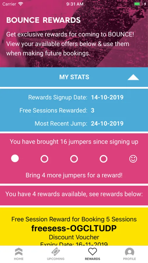 Log in to your BOUNCE App to view, make and manage your bookings. Check out your rewards TAB and redeem them when you book online. You’ll also see the latest updates and offers from BOUNCE within your App.