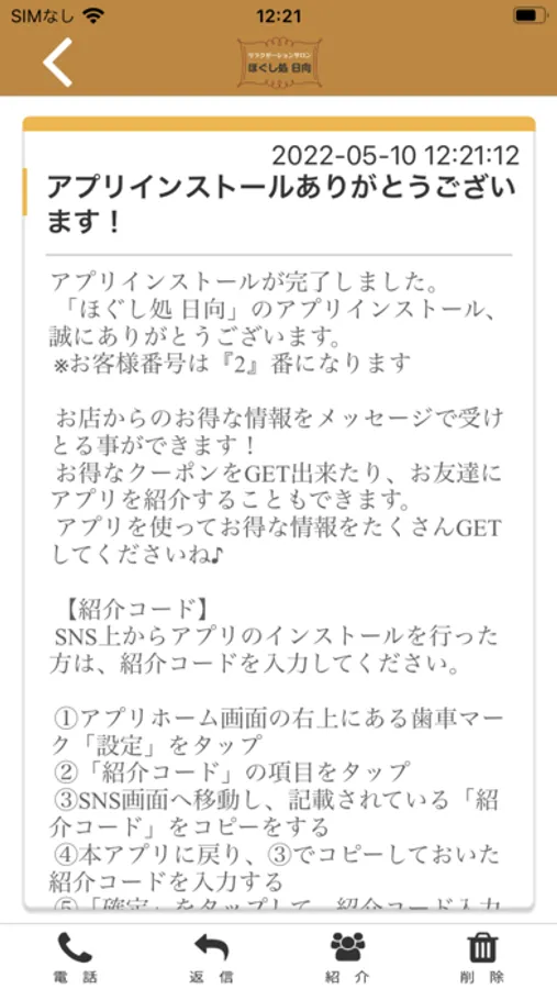 ほぐし処日向のアプリをSNSを通じてお友達に紹介する事ができます。