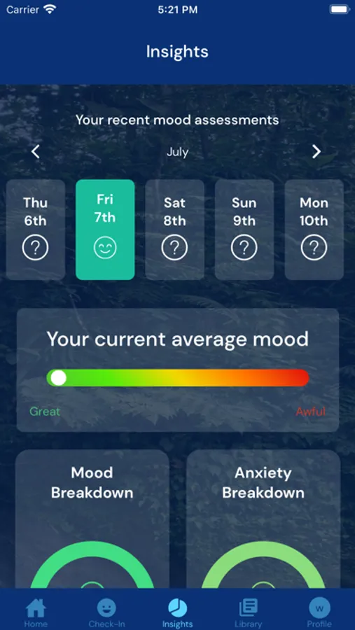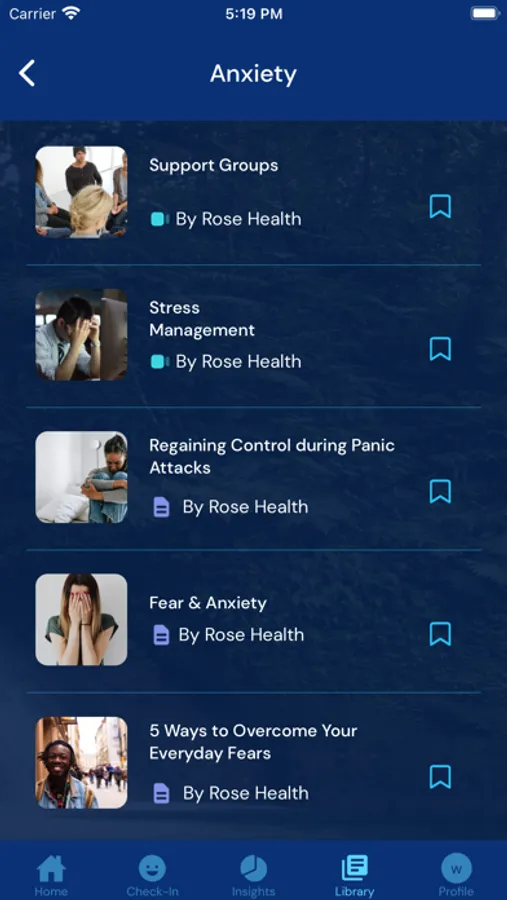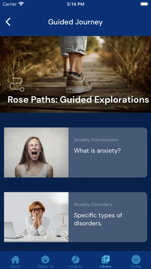 Rose Health selects tailored and curated content (e.g., self-help articles, audio, video) and provides feedback (e.g., weekly summary score of mood and anxiety) based on user input (e.g., journal entries, daily mood rating).