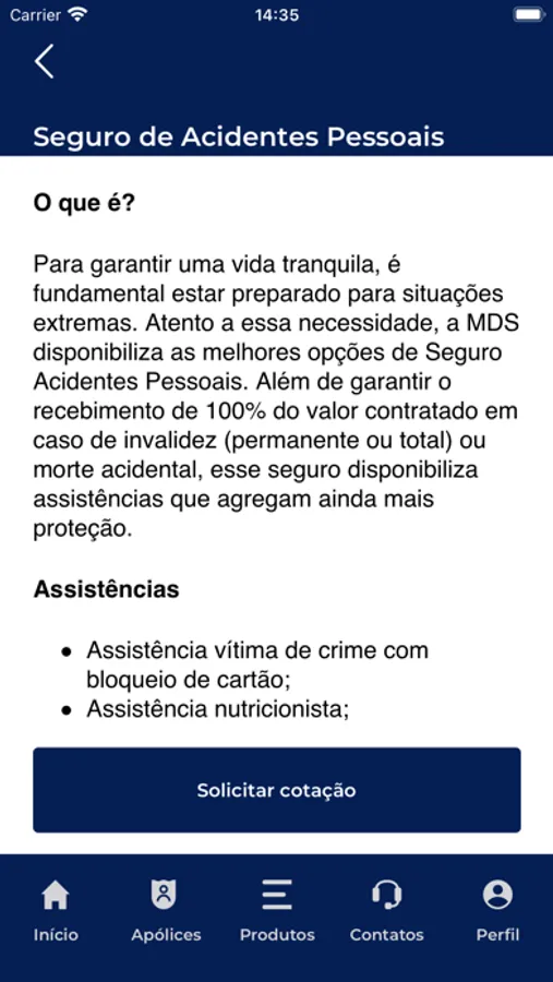Além disso, o App MDS Brasil possibilita ao segurado solicitar cotações diretamente com a Central de Atendimento e a atualização de seus dados pessoais sem que precise ligar para a corretora.