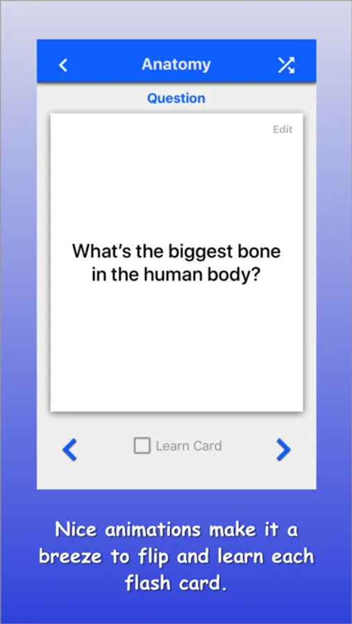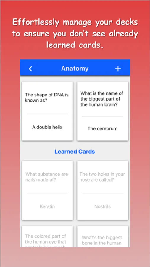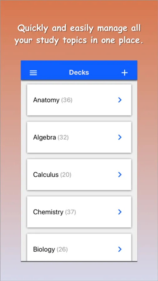 Tests worth of information stored conveniently in your phone. Quickly create and manage decks of flash cards to ensure you receive the grades you deserve. Easily send your flash cards to friends to spread the studying around.