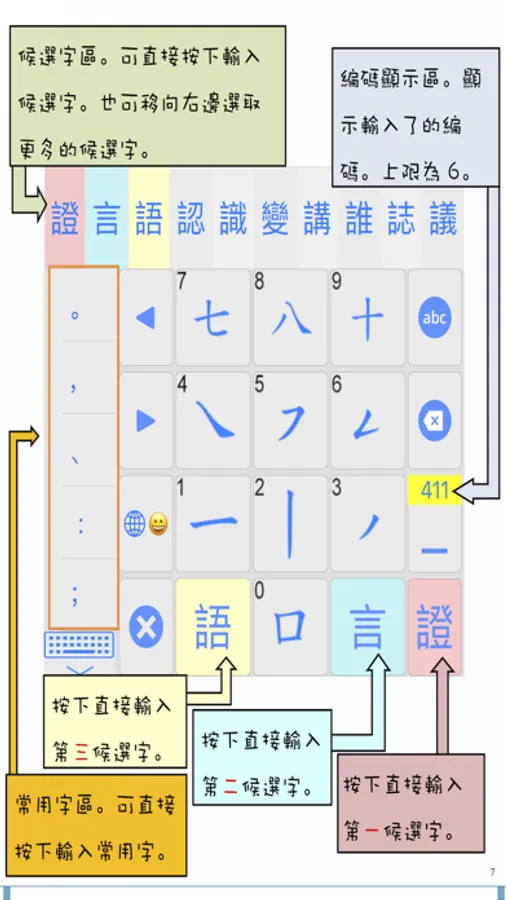 筆順碼以數字鍵盤輸入,每個數字代表一種筆劃(基本字碼)或複合字碼。