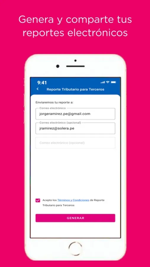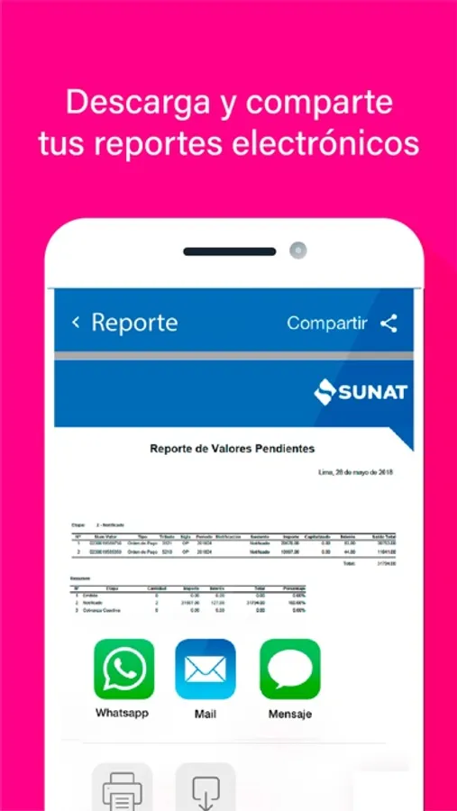 Generar y compartir reportes electrónicos (autenticados por la SUNAT) de tu ficha RUC, deudas, declaraciones y pagos.