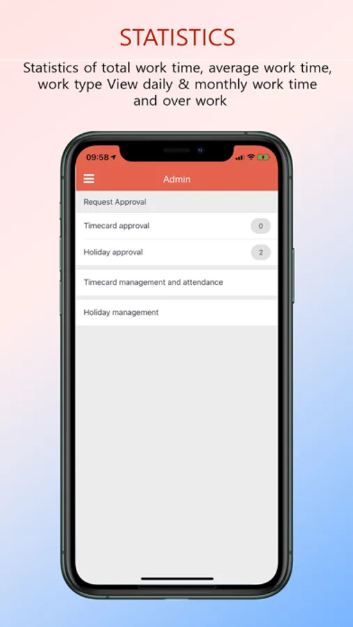 Statistics: You can view the total working hours, average working hours, and working status by day or month.