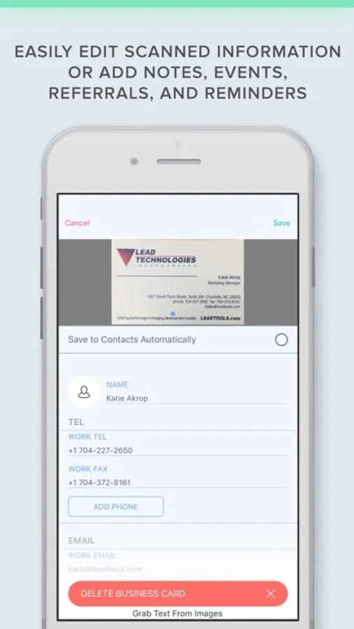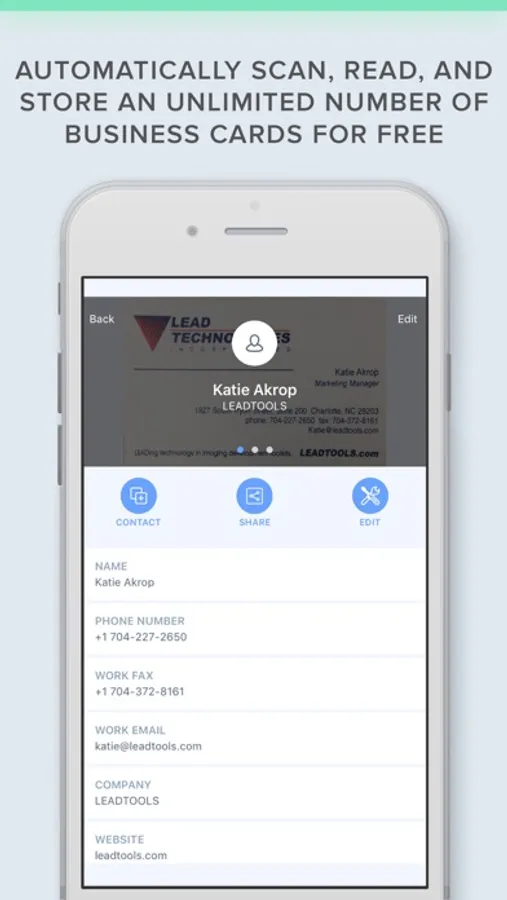 - Automatically scan, read, and store an UNLIMITED number of business cards for FREE