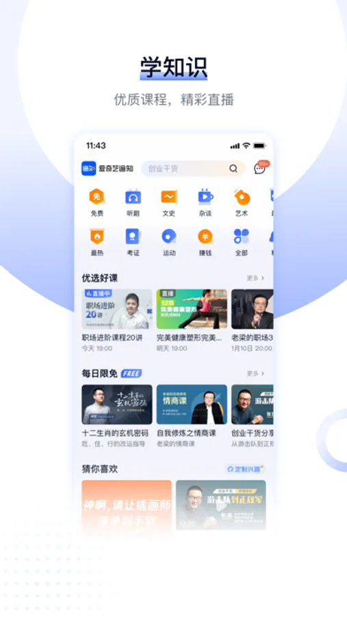 爱奇艺知识是爱奇艺出品的知识学习平台,内容涵盖职场、文史、生活、兴趣、财经、外语、亲子、艺术、听书等多个领域,上万门课程,总有适合您的知识,帮您实现自我提升。
