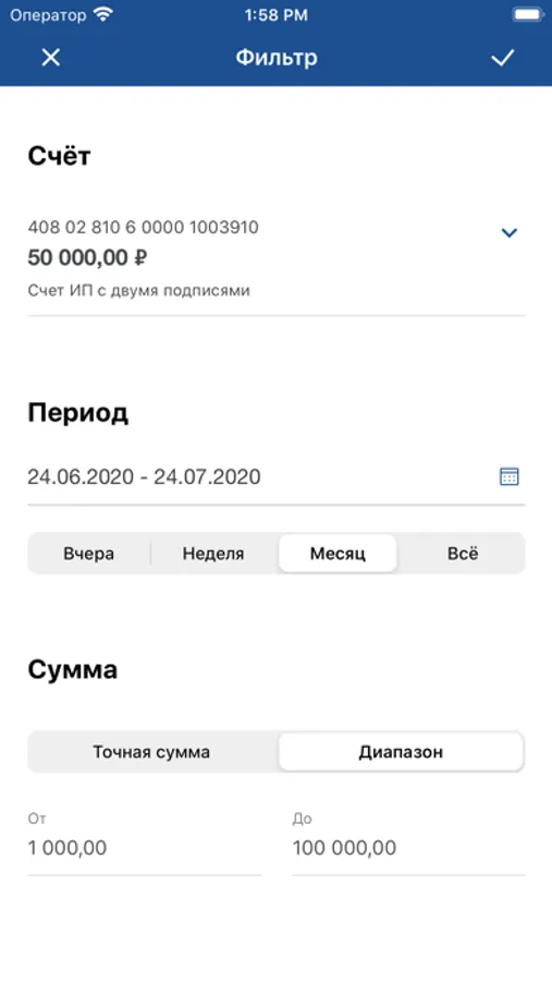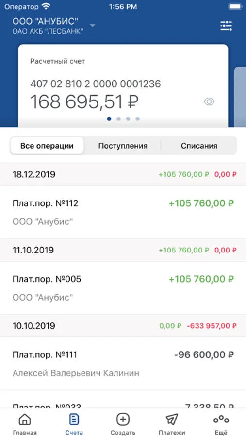 - формировать выписки по счетам и искать операции по сумме и за конкретный период