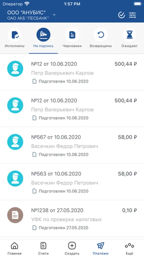 - создавать, подписывать и отправлять в Банк платежные поручения
