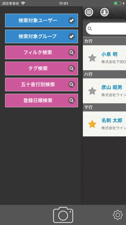 クイック検索、詳細検索、タグ検索、所有外名刺検索、重複名刺検索
