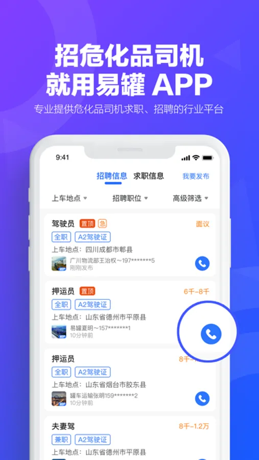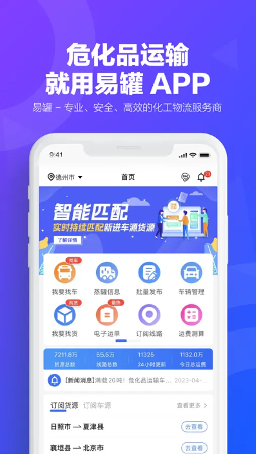 打开易罐app,高达5条/秒的货源、车源推送速度,让你一天收获全国100000+条货源、车源。订阅线路后,有货有车实时提示,将“滴滴打车”的模式应用于危化物流货运领域,同时进行运输全过程动态可视化监管,为安全运输保驾护航,让危运司机有货拉拉货,货运帮找货源运满满。海量货源车源总有一个是你急需的,提供最简单高效的危化物流货运服务。