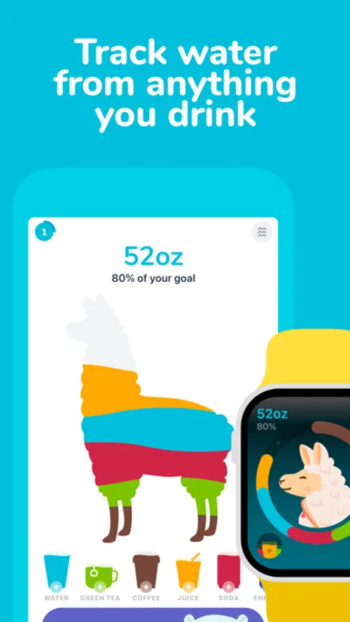 Waterllama free water drinking app features: track water intake, smart reminders, water reminder apple watch app, streaks, water intake goal calculator, custom daily water goal, llama character, water intake calendar, lock screen widgets, water cup size, Oz/Ml units, Apple Health sync and more.