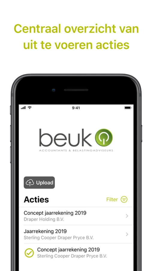 Met de Mijn Beuk app heb je 24/7 mobiel toegang tot je eigen administratie en kun je veilig en snel informatie uitwisselen met je accountant. Je ontvangt handige push notificaties als er acties voor je zijn.