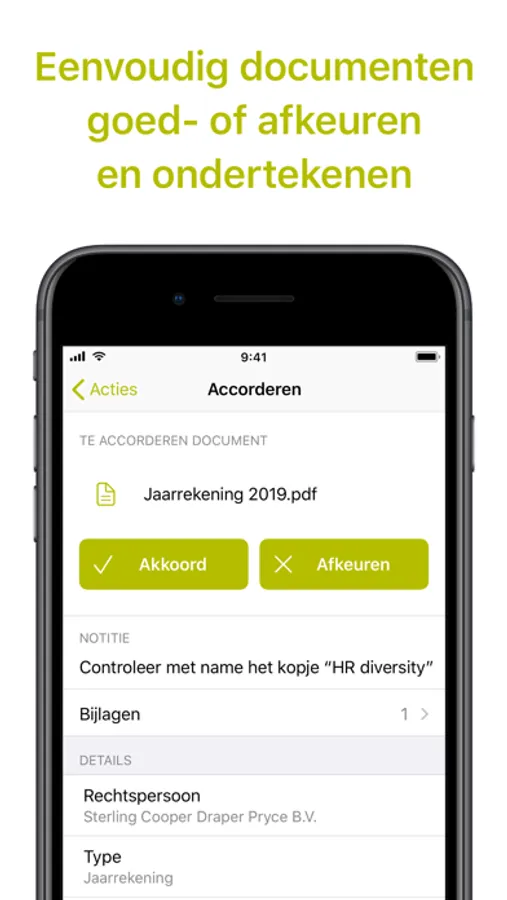 Keur in een paar seconden documenten als belastingaangiften en jaarrekeningen goed. Deze kunnen daarna direct worden verstuurd naar bijvoorbeeld de Belastingdienst of Kamer van Koophandel. Je krijgt een push notificatie als je een document kunt goedkeuren.