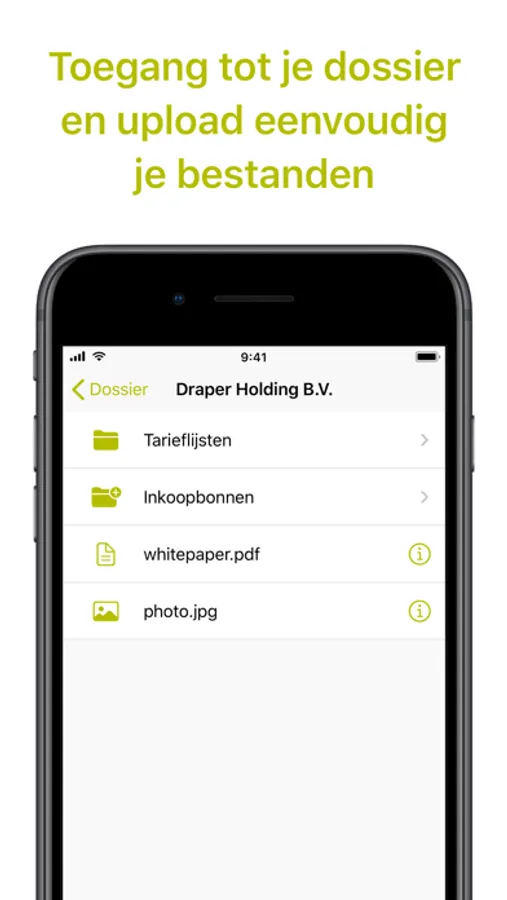 Je kunt in de Mijn Beuk app op ieder moment en overal zelf je dossier inzien, specifieke documenten bekijken en deze eventueel opslaan of openen in andere apps. Bovendien kun je bestanden als facturen en contracten makkelijk delen met je accountant, door er een foto van te maken of ze te uploaden vanaf je telefoon.