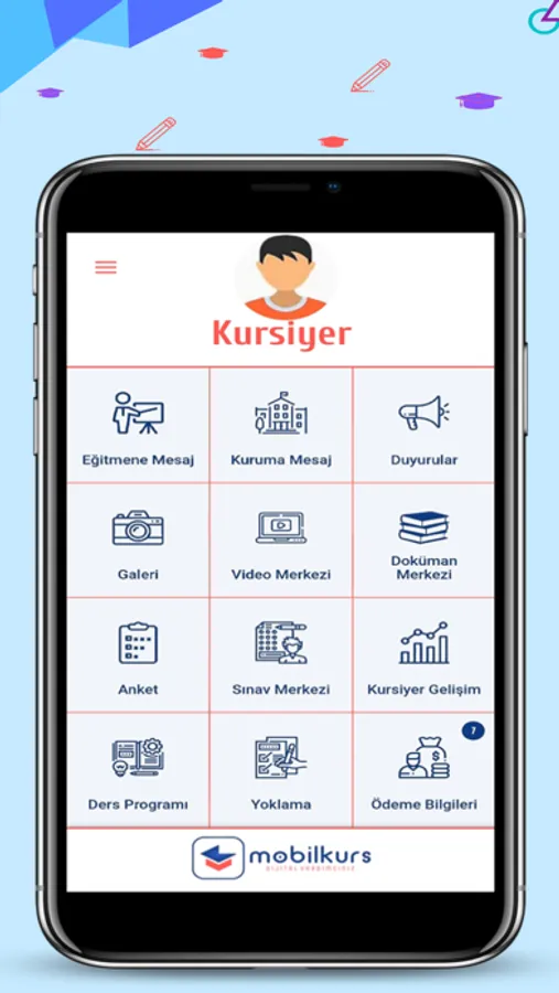 Mobil Kurs Uygulaması ile kursiyerlerin, eğitmenlerin ve velilerin her türlü bilgilerine anında ulaşabilir, uygulama üzerinden duyuru ve mesaj göndererek bilgilendirebilirseniz. Eğitmenler uygulama üzerinden yoklama alabilir, fotoğraf ve video paylaşabilir, kursiyerlerine özel mesajlar gönderebilir. Yöneticiler uygulama üzerinden kurumunun mali durumunu görebilir, tüm kurumun yoklamalarını takip edebilir. Kursiyerlerin gelişimlerini kayıt altına alabilir. Dilerseniz Quiz hazırlayıp , kursiyerlere gönderebilirsiniz.
