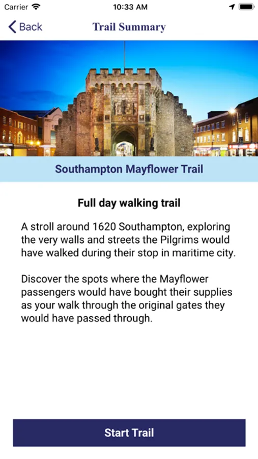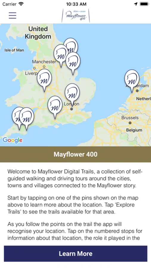 The walking tour guide app contains a trail for each of the towns and cities connected to the Mayflower. They include: