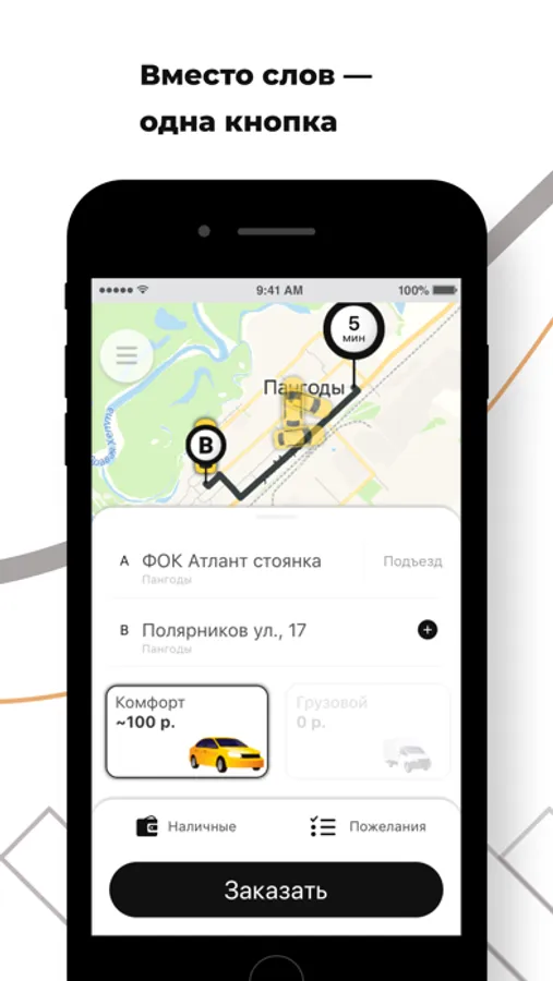 Откройте приложение, укажите адрес и закажите такси, нажав на одну кнопку.