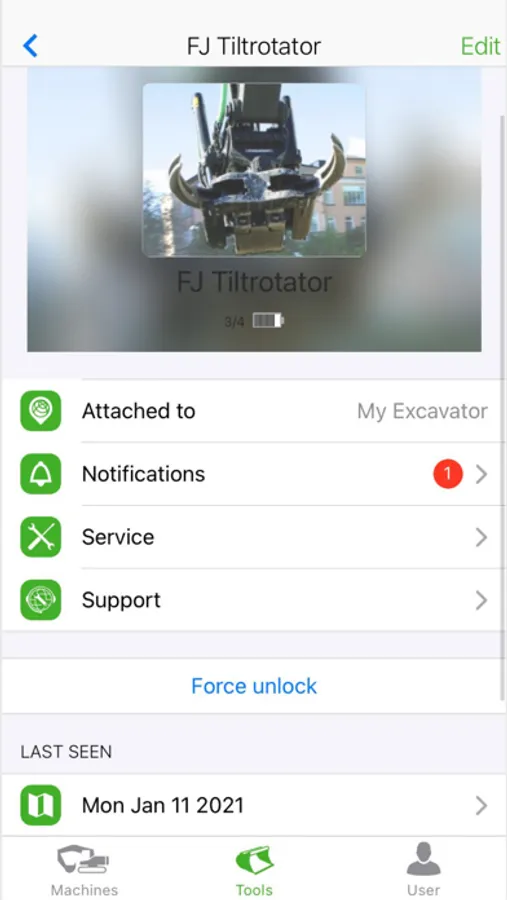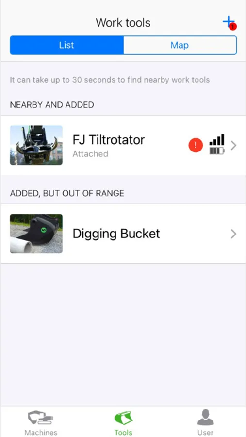 The app gives you fleet management functions that track your excavator work tools equipped with ToolRec modules. The system monitors both the physical position and use. Work tools can be given individual hydraulic/speed settings which are applied automatically when the work tool is changed*¹. If you have regular service intervals on your tools you can set notifications to automatically alert you when it's time for service. A map view in the app lets you see where you left your work tools.