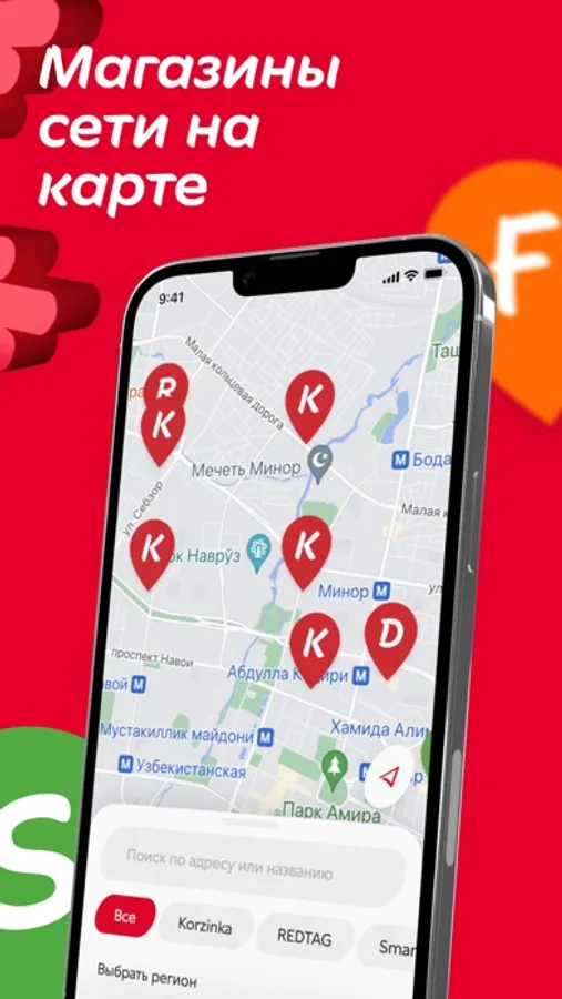 We will help you find the nearest Korzinka, no matter where you are: we will select the addresses of supermarkets near you, show you the opening hours and suggest the shortest route.