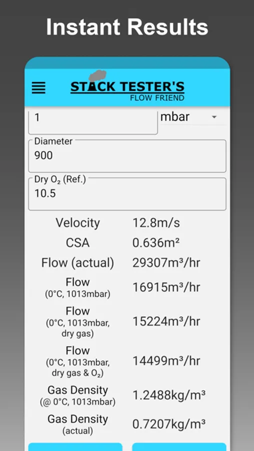 When working on the stack and you need to quickly calculate a velocity or volume flow, the answer can be at your fingertips. By inputting the essential parameters of the stack size and gas conditions, the velocity and volume flow can be determined without the need to manually calculate the value or start up a laptop. The app is an essential tool for the professional Environmental engineer.