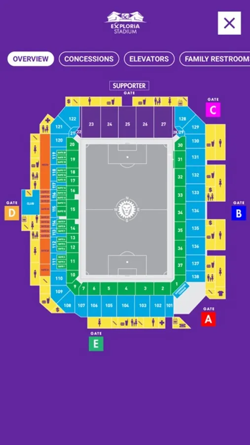 - Attending a match at Exploria Stadium? The app will help you find your way around, from gates, to restrooms, to Team Store or Food & Beverage concessions.