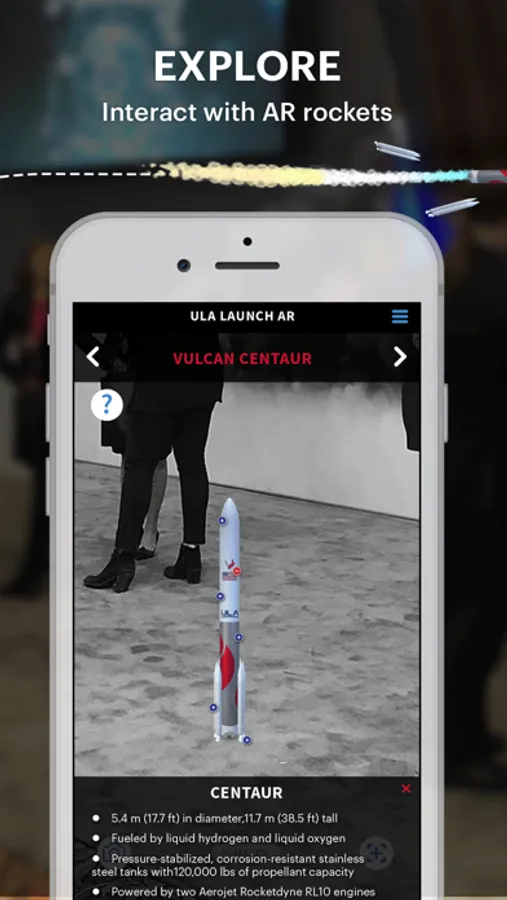 Using Augmented Reality, you’ll have the ability to place rockets in your space – wherever you are – and up to full scale. Stand back and take-in a full size rocket, taller than a 20-story building. Then let your friends know you’re a rocket scientist by sharing your photos taken with ULA’s Vulcan Centaur, Atlas V and Delta IV rockets.