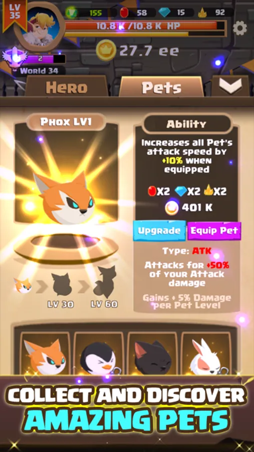 -Unlock many different kinds of pets and level them up to evolve them. Each pet has a unique and powerful ability!
