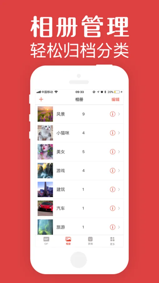 GIF浏览器是一款可以播放系统相册中的GIF动图、查看和保存GIF的每一帧图片,对GIF相册进行管理的App。