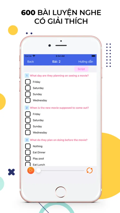 Với phần luyện nghe giúp các bạn cải thiện kỹ năng nghe của mình khi vừa nghe vừa trả lời các câu hỏi. Và đặc biệt có script của mỗi bài giúp bạn luyện tập thật dễ dàng.