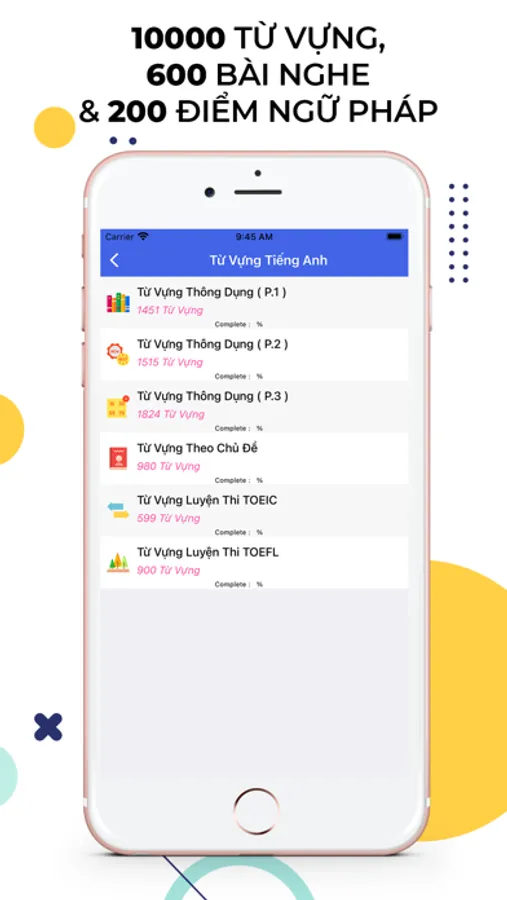 Ứng dụng học tiếng anh tốt nhất trên IOS với dữ liệu từ cơ bản đến nâng cao. Hơn 10000 từ vựng, 600 bài luyện nghe, 2000 câu giao tiếp tiếng anh cơ bản.