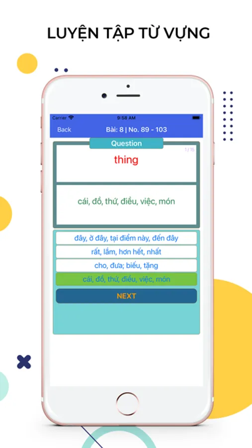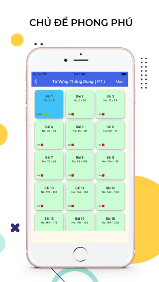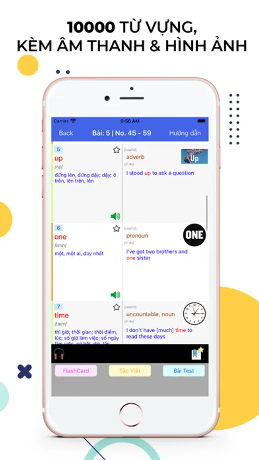 Tất cả từ vựng đều có âm thanh bản địa, ví dụ và hình ảnh giúp các bạn học tập tốt nhất. Các bạn có thể chọn các chức năng học như FlashCard , tập viết . Và đặc biệt là sau mỗi bài học sẽ có bài Test. Đừng quên hoàn thành nó nhé.
