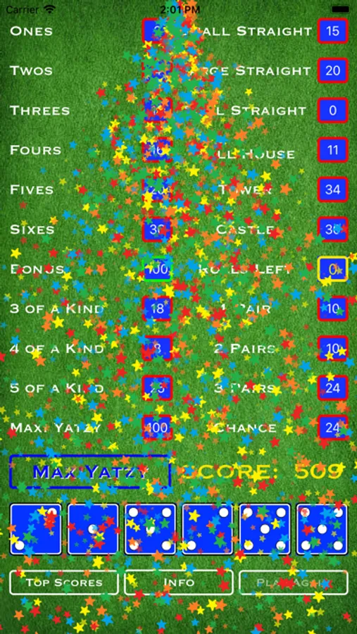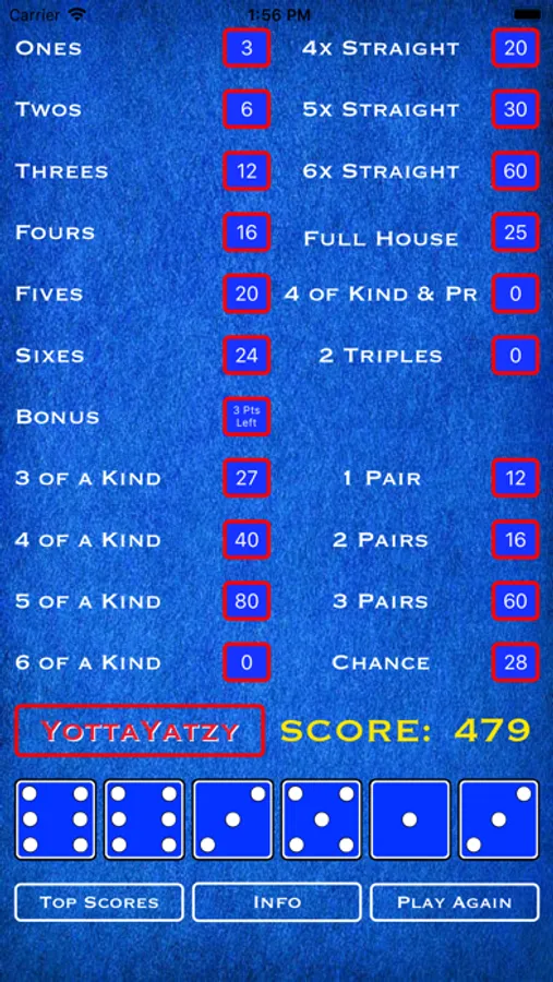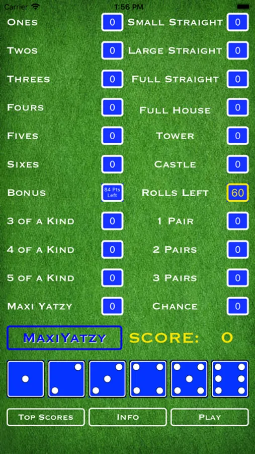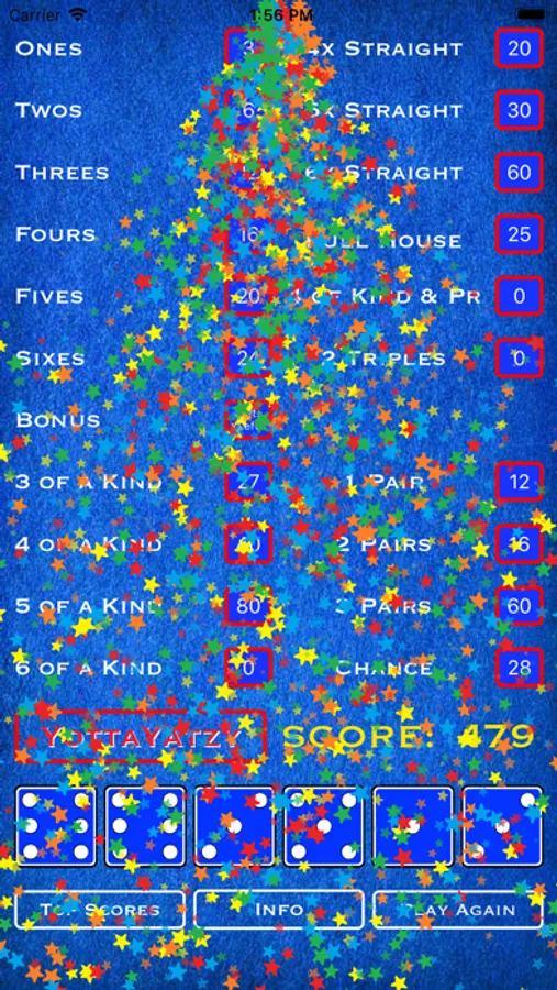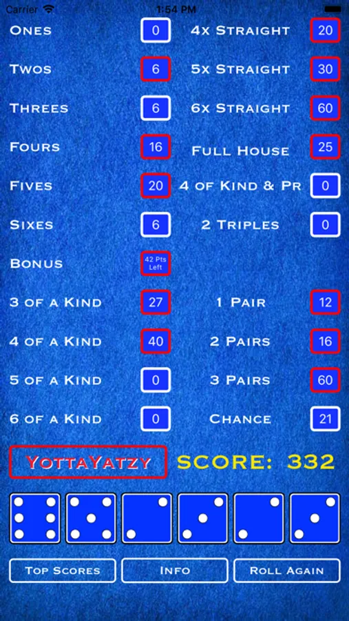 Here's a fun game for all you dice lovers out there. Actually it's two fun games! YottaYatzy is similar to other Yatzy games with several distinctions. First, there are 6 dice which means 20 total rounds. Second, there are numerous ways to get extra bonus points: rolling any of the more difficult combinations in a single roll, or rolling a large straight in order, or of course rolling multiple 6 of a kinds. And when you have mastered YottaYatzy, click the YottaYatzy button to launch MaxiYatzy. MaxiYatzy requires a whole different strategy. There are still 6 dice, but instead of 3 rolls per turn, you get up to 60 rolls per game. Take as many turns as you want to get that elusive combination. Just save enough rolls to try and score in all the categories or you could leave points on the table. Scoring is different too in that most combinations are based on the sum of the dice in play instead of the difficulty of making that combination. Either way, both games are fun for the whole family. See who can get the highest score and reach the top of the leaderboard! Happy rolling!