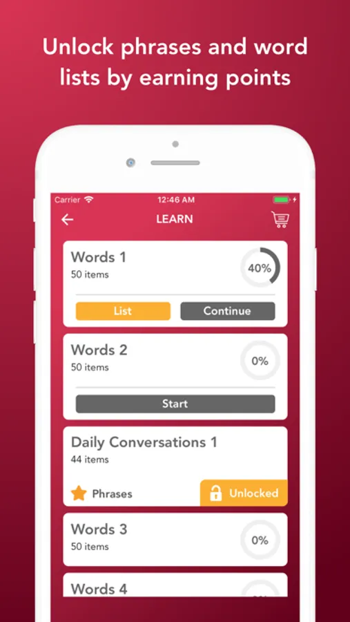 - Earn points by learning and practicing. Then unlock phrases and word lists.