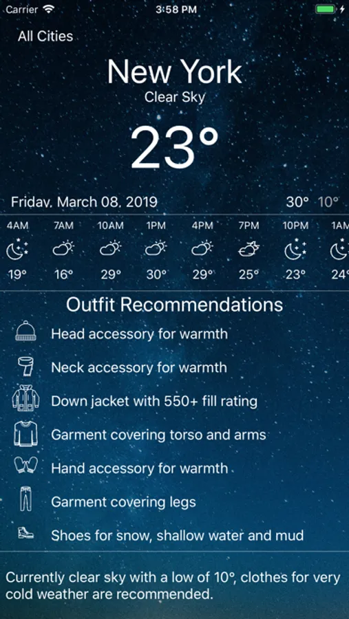 Track the weather in multiple cities and get recommendations for what clothing to wear for the day based on the temperature and weather. This app will help you prepare for the day! If it is cold it will advise heavy down jackets. If there is rain forecasted during the day it will advise you to bring an umbrella. Weather icons and backgrounds are updated depending on the weather and time. Weather can be updated every 10 minutes. Multiple cities can be tracked with New York City as a default. Users are brought back to the city they last viewed when relaunching the app. Google places is utilized for fast and easy search of city.