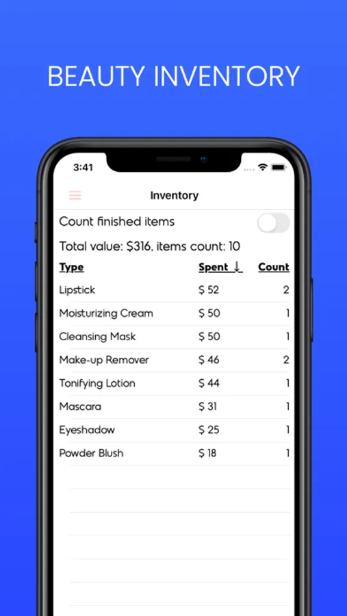 Beautistics will collect and show you the statistics about your collection: prices and spending, amount of bought and finished products during different time periods, it will also show you the most crowded categories of your collection.