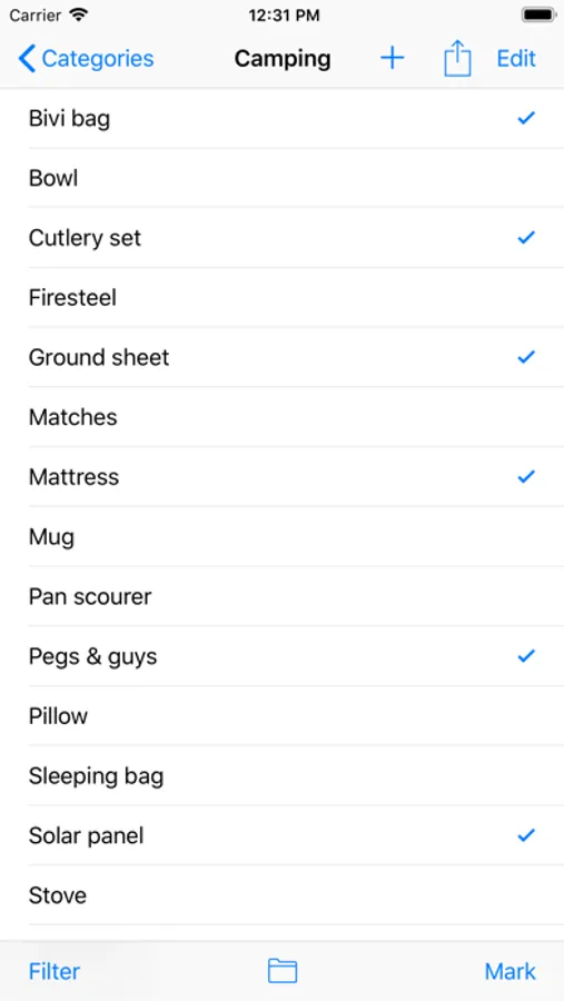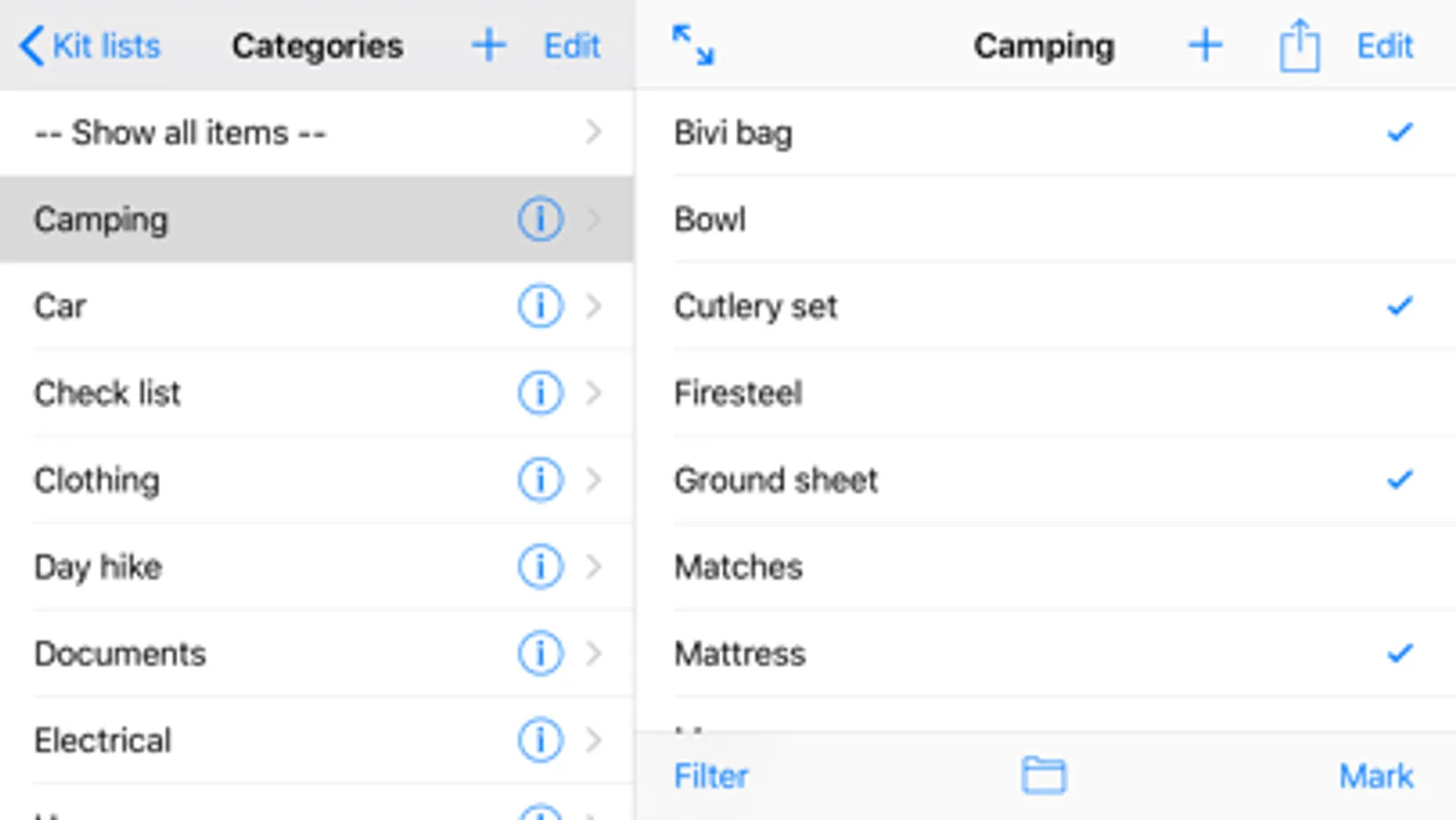 The concept is that you maintain a full list of all items you may require for any activity. Items can optionally be grouped into categories, which may relate to specific trips, or simply be used to group items, e.g. items for hiking, cycling or horse-riding.