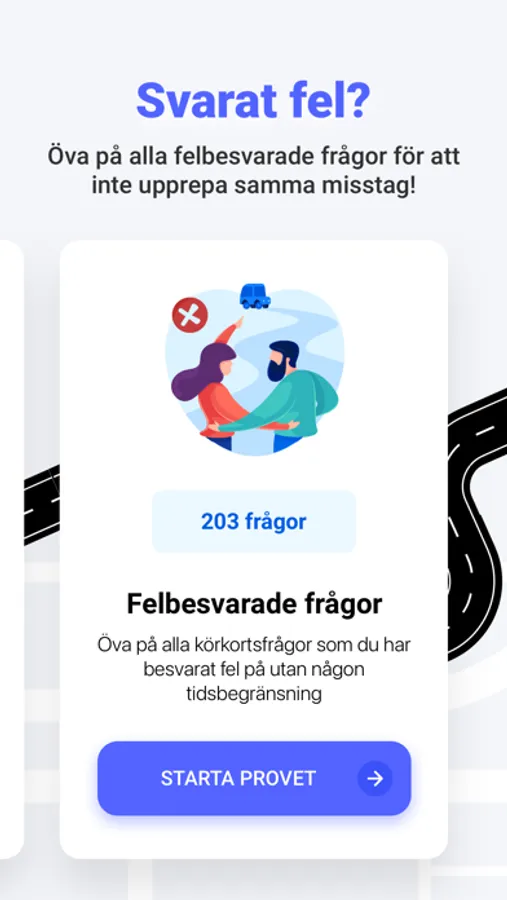 Övning ger färdighet! Träna på alla frågor du har besvarat fel på tidigare för att inte upprepa samma misstag på Trafikverkets riktiga teoriprov!