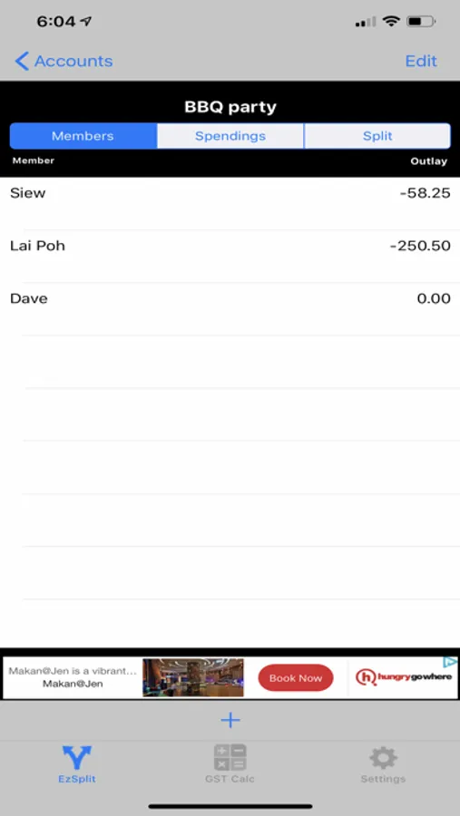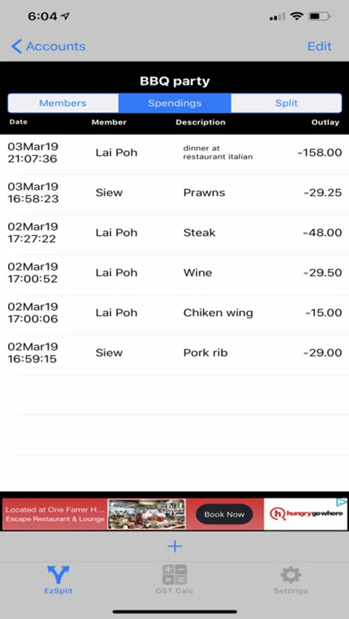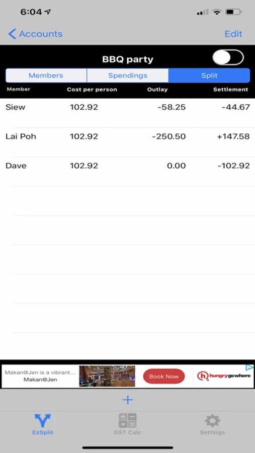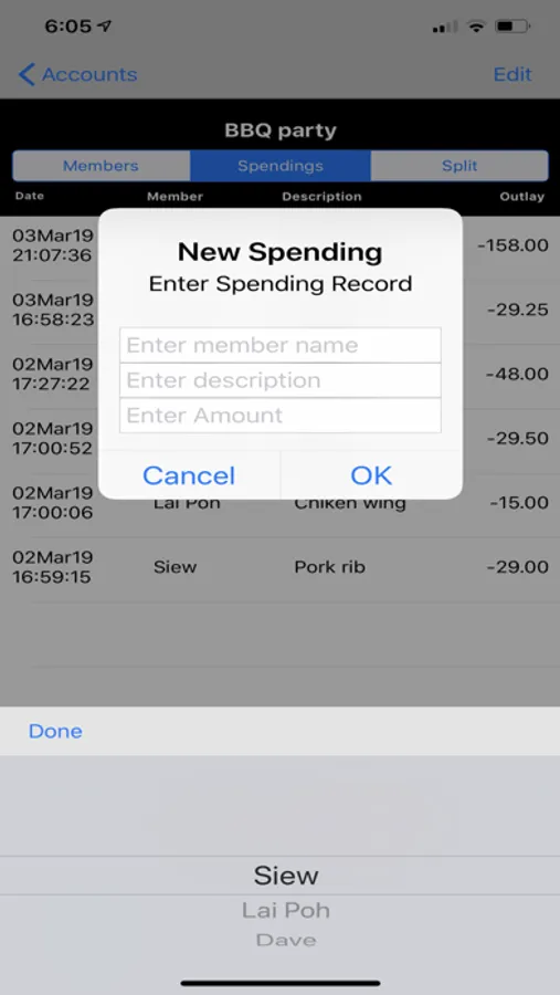 Track and record expenses incurred by members of a group. Split expenses equally among members and calculate the settlement amount for each member.