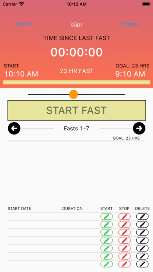 A simple fasting app to help you with your eating schedules. Simplistic graphics, ability to import/export CSV data, as well as ability to look at and edit past fasts. You can tap the timer to see time remaining as well. The slider affects the graph proportionally.