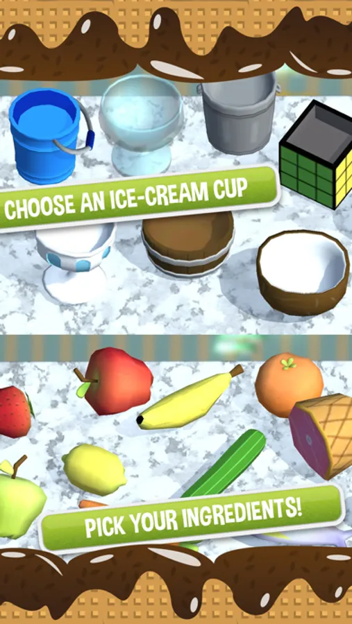 Follow the Recipe Book to unlock unusual ingredients, bowls, cups and waffle shapes. For example, to unlock the Cactus Cup, make a dish out of a Tin Can, 3 scoops of Squid Ice Cream and top it off with 3 Chocolate Chip cookies.