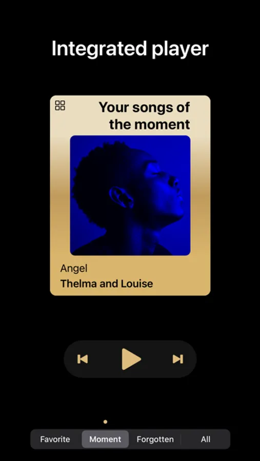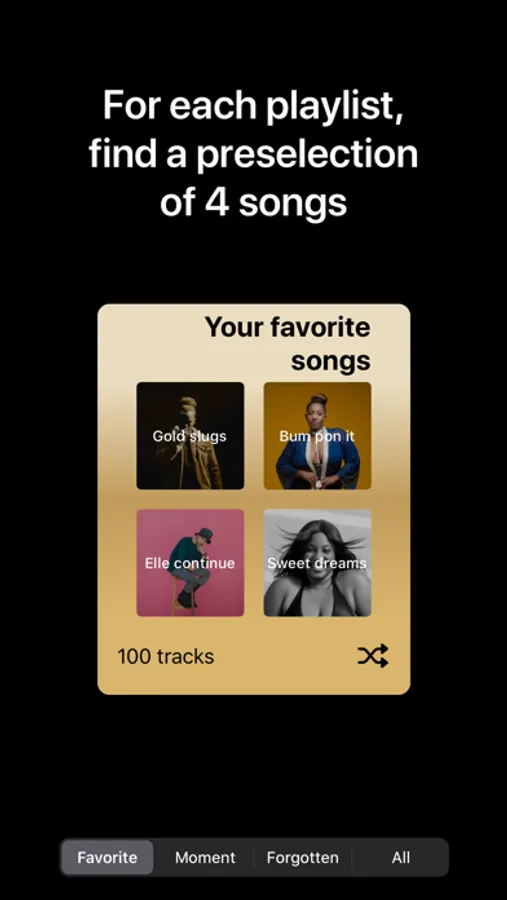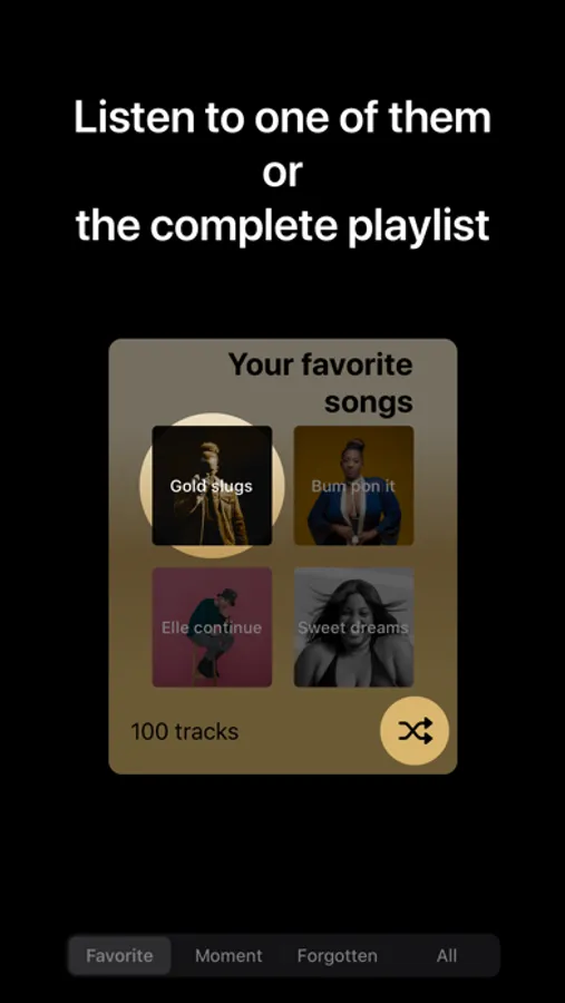 Listen to one of the suggested songs or one of the playlists in just 1 click. The app advises you, you decide!