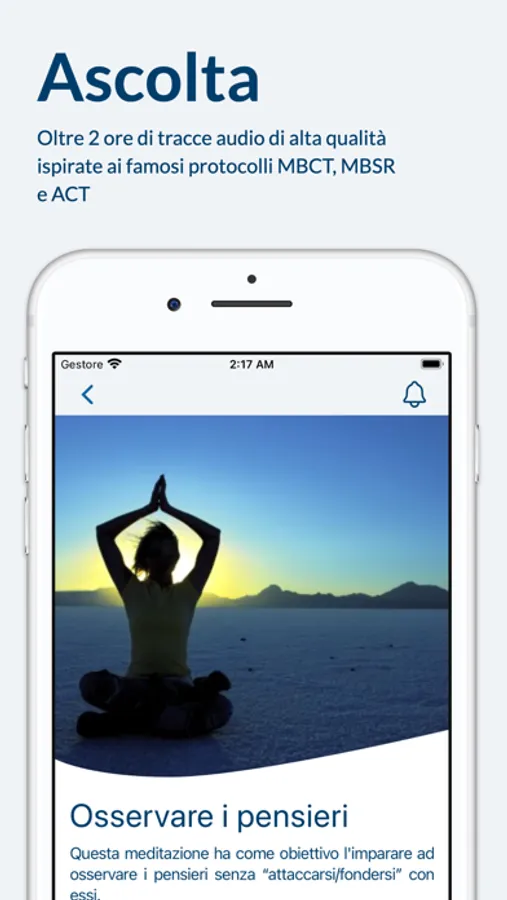 - Oltre 2 ore di tracce audio di qualità inspirate dagli esercizi presenti nei protocolli MBCT e ACT.