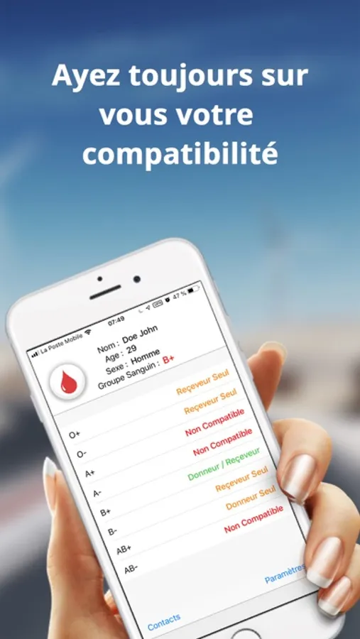 Blood Check is an application allowing you to carry a digital blood group card, with the list of compatibilities (Donor & Receiver) and the ability to save contacts with their blood type (and also have their compatibility).